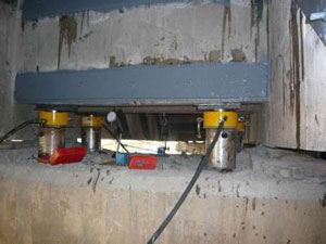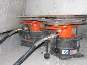 當(dāng)橋梁整體頂升時(shí),其承載噸位一般達(dá)到千噸級(jí)別,在如此重載之下,我們要設(shè)置千斤頂與墩基的連接結(jié)構(gòu)。為保護(hù)我們的千斤頂?shù)鬃c水泥結(jié)構(gòu)之間的直接磨損,我們需在超薄型液壓千斤頂?shù)牡撞繅|入金屬塊,一方面能夠承受千斤頂與水泥墩之間的整體受力,一方面能防止千斤頂在操作過(guò)程的缸體受損。
